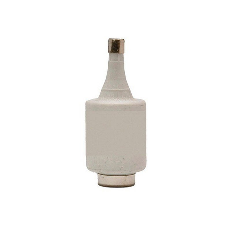 Tiene una forma cilíndrica que se asemeja a una botella, con terminales en ambos extremos para la conexión dentro del portafusibles.