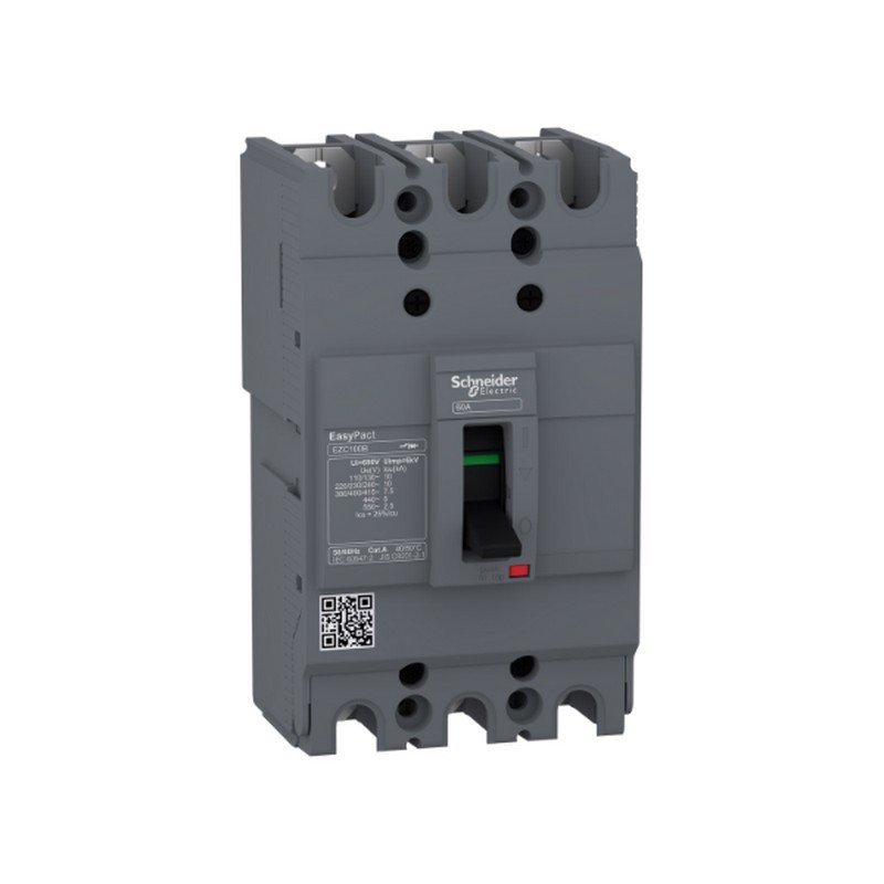 Esta versión del producto está diseñada en un marco de 3 polos con detección en 3 polos y unidad de control TMD equipada para protección magnetotérmica. El dispositivo puede montarse en posición vertical u horizontal en un tablero metálico, y protegerse contra riesgos de seguridad mediante el bloqueo por candado. Además, la dimensión fija es 75mm (ancho), 130mm (alto) y 60mm (profundidad). El grado de protección es IP40 para el mando rotativo directo e IP54 para el mando rotativo prolongado. Esta serie dispone de slots utilizados para el posicionamiento auxiliar de bobinas de disparo o señalización, en función de dónde se haya insertado en el dispositivo situado detrás de la cubierta frontal del breaker termomagnético. Este producto umple con la norma IEC6947, la certificación CE y algunos laboratorios independientes (KEMA, ASEFA, TUV) o Tilva de terceros. Tambien está certificado para su funcionamiento en un entorno con un grado de contaminación III, según la definición de IEC6947, y supera la prueba de condiciones extremadamente atmosféricas. Los interruptores termomagnéticos EasyPact EZC cuentan con la etiqueta Green PremiumTM, la cual promete el cumplimiento de las reglamentaciones más recientes, transparencia sobre los impactos medioambientales, productos circulares y de bajo nivel de CO2.