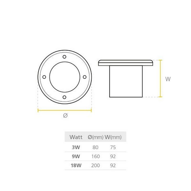 Luminaria de piso LED de 18W con luz blanca cálida (3000K), clasificación IP65, diseñada para instalación incrustada en exteriores, ofreciendo un diseño moderno y eficiencia energética.