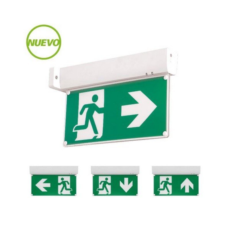 Aviso LED de señalización de emergencia con batería integrada que ofrece 180 minutos de autonomía, diseñado para montaje en techo o pared, con un diseño compacto y eficiente.