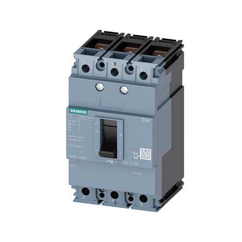 Interruptor automático 3VM1 IEC Frame 100 Clase de poder de corte B Icu=16kA @ 415V 3 polos, protección de distribuciones TM210, FTFM, In=100 A protección de sobrecarga Ir=100 A invariable protección de cortocircuito Ii=10 x In conexión plana con tornillos